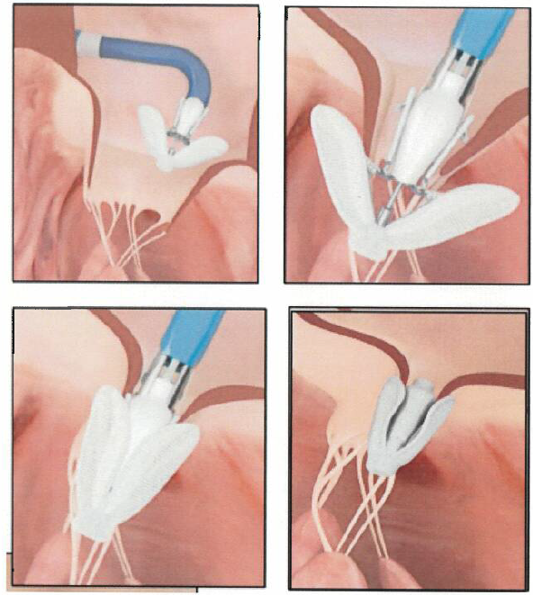 Neben der Operation am offenen Herzen und dem Austausch oder der Reparatur der Klappe kann eine Insuffizienz der Mitralklappe durch minimalinvasives Verbinden der Segel der Herzklappe behandelt werden. Bei diesem Verfahren wird mittels eines Katheters eine Verbindungsvorrichtung ("fixation device") in das Herz implantiert. Die Vorrichtung greift die Segel der Mitralklappe, verbindet sie und bleibt auf den Mitralklappensegeln zurück. Somit erhält die Öffnung der Herzklappe die Form einer "8" statt eines "O"; dies reduziert die Öffnung der Herzklappe. Dadurch nimmt der Rückfluss ("regurgitation") des Blutes in den linken Vorhof ab und die Pumpleistung des Herzens steigt.