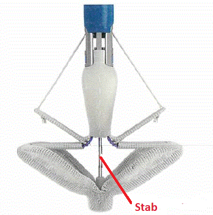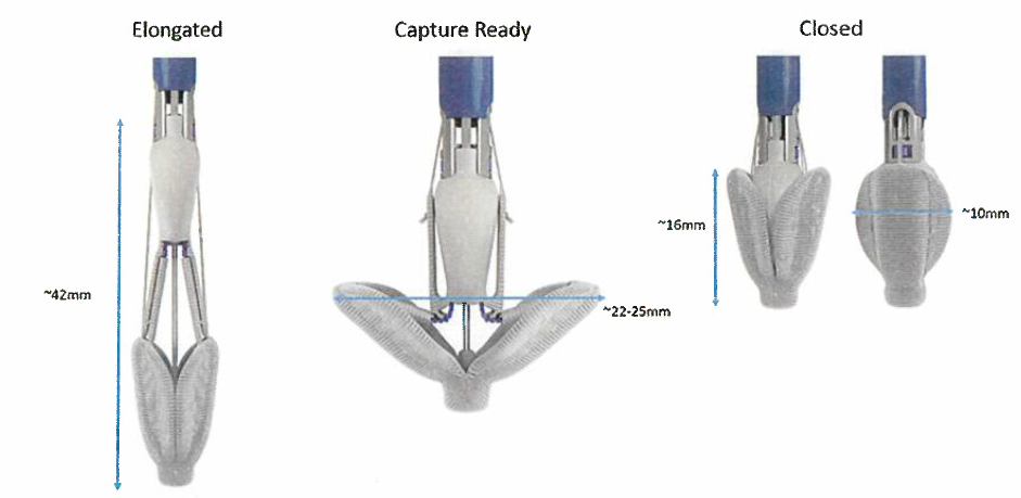 Links wird die Fixierungsvorrichtung der PASCAL-Vorrichtung in der bereits erwähnten gestreckten Stellung gezeigt, in der Mitte in der zum Greifen (der Herzklappensegel) bereiten Stellung und rechts in der geschlossenen Stellung, in der die Fixierungsvorrichtung im Herzen zurückgelassen wird (in der Abbildung 5 ist die Fixierungsvorrichtung immer noch mit der blauen Steuervorrichtung verbunden, die vom Operateur ausserhalb des Körpers bedient wird).